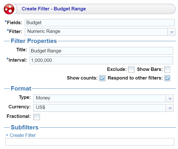 Numeric Range filters are similar to Date Range filters but are available for properties with numeric (integer or double) data types. You can also perform a function on a property so that it results in a number value, such as using the COUNT function. These filters enable you to define numeric ranges and group the results into those ranges.