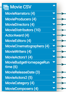 The second object shows the data that came from the data source, 14 Movie CSV files as shown in the example. To expand the rectangle to view the files and additional details such as the schema information or list of properties from each file, click the triangle icon on the top right of the rectangle: