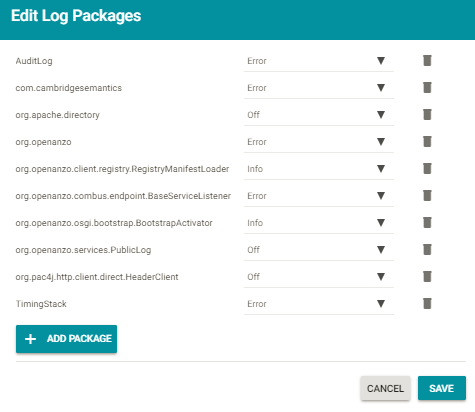 - Click the drop-down list next to the new package to set the logging level. The log level that you choose specifies the type and amount of information that Anzo logs for the component:
