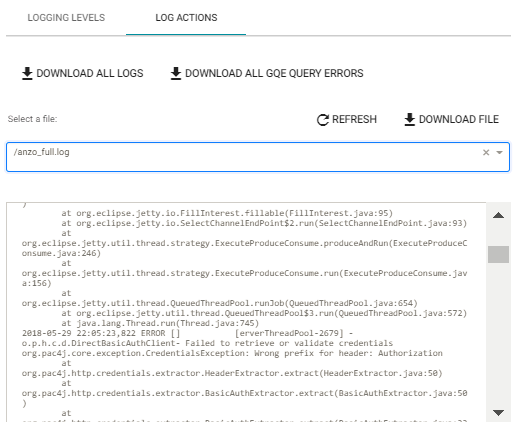 - If you want to download a .zip file that contains all Anzo log files, click the Download All Logs link. If you want to download just the query error logs for AnzoGraph, click Download All GQE Query Errors.