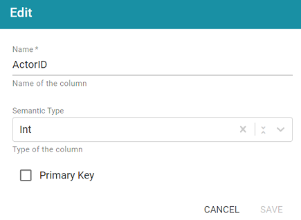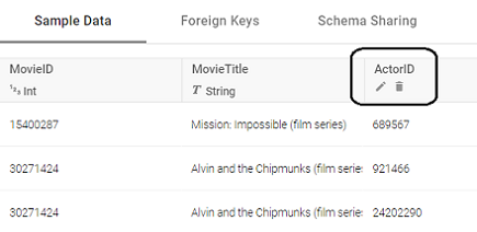 - On the right side of the screen, find the column that you want to label as the primary key. Hover your pointer over the column name to display additional icons. Edit and Delete icons replace the data type under the column name. For example: