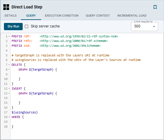 Typically Direct Load Step queries are GDI RDF and Ontology Generator queries. Using a relatively simple SPARQL query, the GDI Generators recognize the structure of a data source and automatically generate the necessary statements. Invoking the Generators is preferable when the structure of the data is very complex, such as a JSON data source with many inner repeating structures or a database with many tables and keys. When the source contains complex structures, only the required statements are generated, avoiding cross-products and optimizing query execution and memory usage. For details about writing GDI Generator queries, see GDI Generator Query Syntax