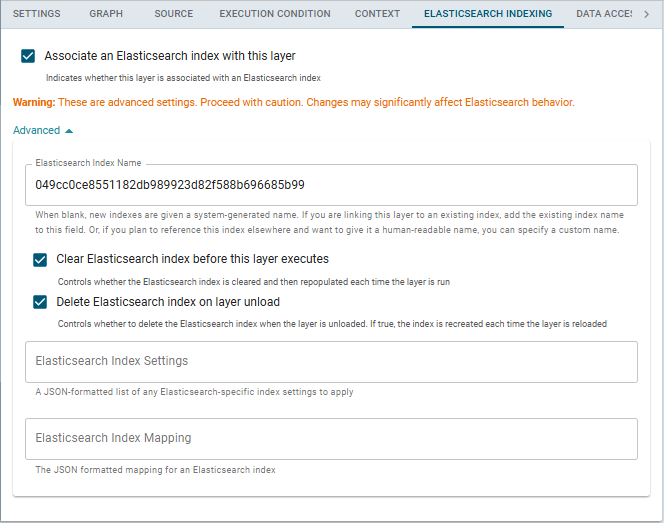 The warning is to inform you that the Elasticsearch index-related configuration settings at the layer level are automatically adjusted to the default settings for layers that contain Elasticsearch Indexing or Snapshot Steps. Those settings are on the layer's Elasticsearch Indexing tab. The image below shows the tab with the default settings: