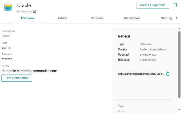 - Before proceeding to select or create a schema, you may want to test connectivity to the database. To do so, click the Overview tab and then click the Test Connection button at the bottom of the screen.