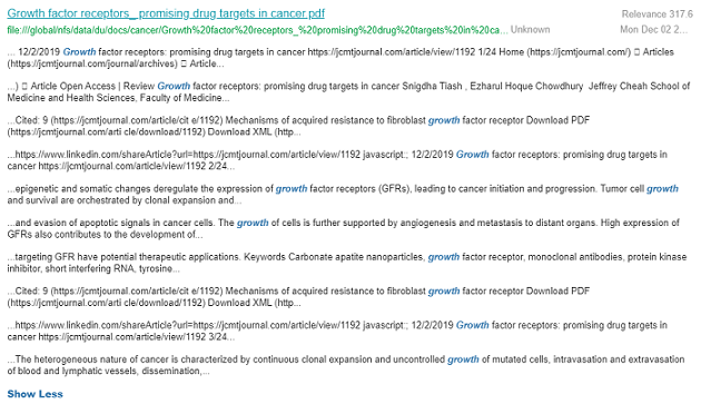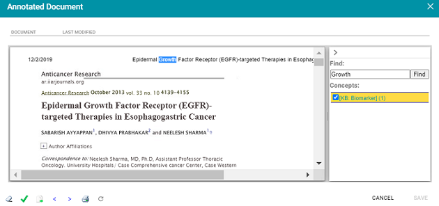 - To refine the search, alter the text in the Search field and press Enter again. You can also click highlighted terms in the search results to open a dialog box that shows the full annotated document where the match was found. For example: