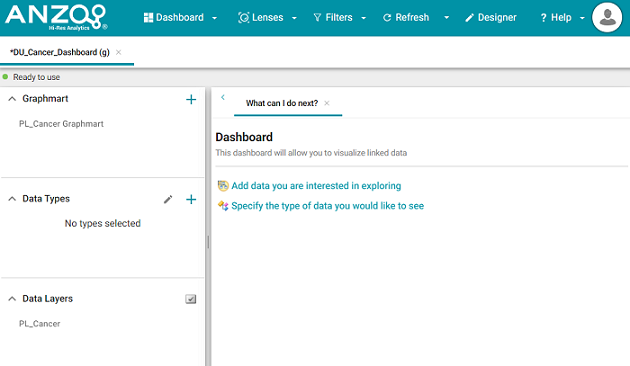 - Type a name for the dashboard in the Title field and enter an optional Description. Then click OK. Graph Studio creates the dashboard and populates the Graphmart and Data Layers panels. For example: