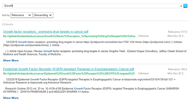 - To run a search, type the text to find in the Search field and press Enter. See the Supported Search Syntax section below for information about supported search syntax. Graph Studio finds documents that include the search value and displays the documents, snippets of text to show the context of where the matches were found, and the Elasticsearch relevance score for the match. For information about how the relevance score is calculated, see What Is Relevance? in the Elasticsearch documentation. For example:
