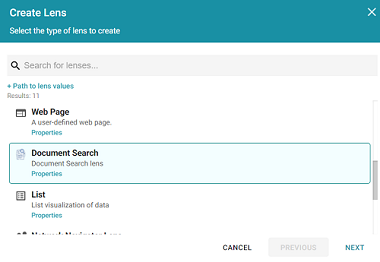 - In the Create Lens dialog box, select Document Search and then click Next. Graph Studio displays the General Information dialog box.
