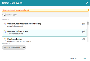 - In the Data Types panel, click the plus icon (+) to open the Select Data Types dialog box. In the dialog box, select Unstructured Document.