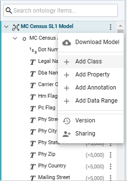 Start editing the model by clicking its menu (the dots to the right of the model name in the top row) and select Add Class.