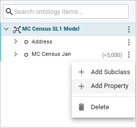 To factor all these address-related target properties into the Address class created previously, click the menu of the original class (MC Census Jan) in the right pane. From the menu, select Add Property.