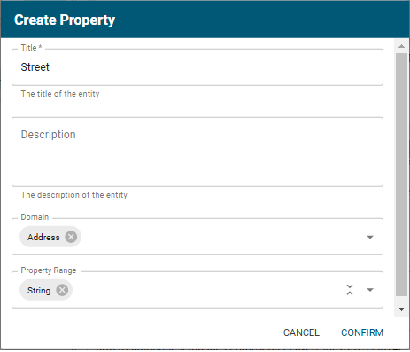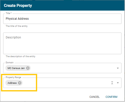 The Create Property screen opens. Specify the Title ("Physical Address" in this example). For Property Range, we can now select the new Address class.