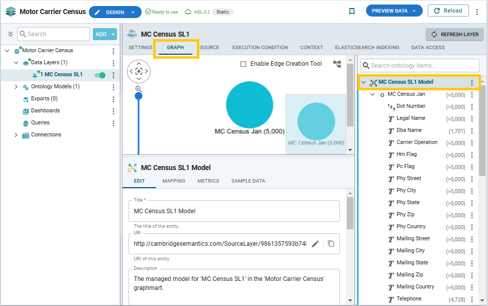 Go to the Graph tab of the data layer screen. The right pane shows the model generated from the data layer. Expand the model to view its classes and their properties. Select the top level by clicking the model name.