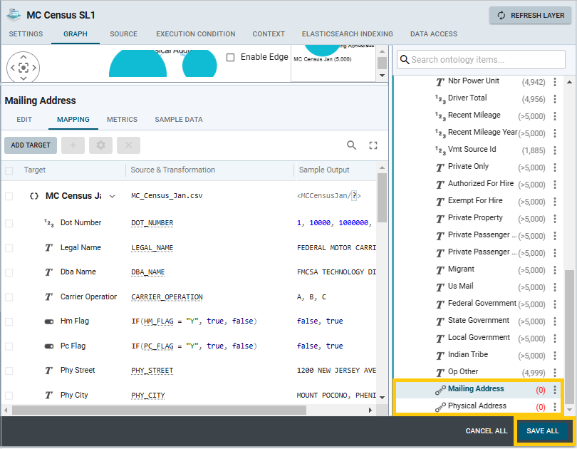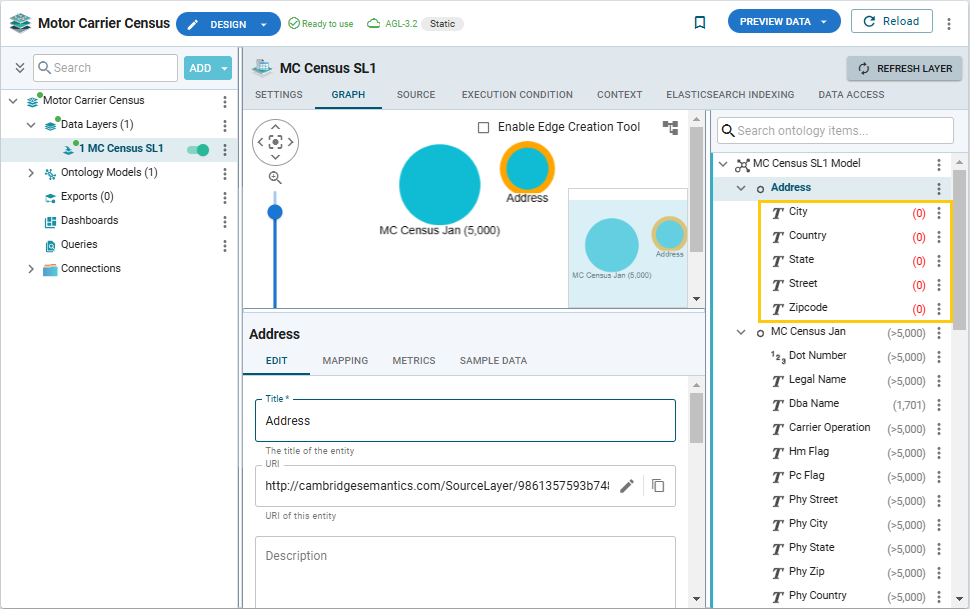 The mapping tool in the Data Layer interface allows the user to map nodes and properties for easier management of data and ontologies. This section provides instructions for using the Mapping tab in grpahmart's Data Layers to add object mappings in your models.