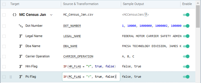 For example, the data type of binary properties Hm Flag and Pc Plag is currently String. You can convert them to Boolean by double-clicking in the Source & Transformation field and specifying the appropriate transformation: IF (HM_FLAG="Y", true, false). Note that context-sensitive syntax help and warnings are provided as you type expressions in the Source & Transformation field.