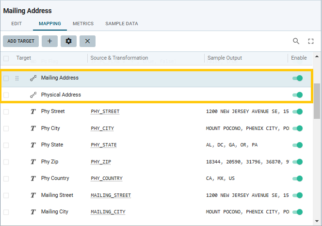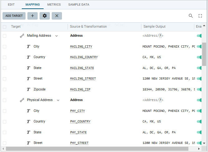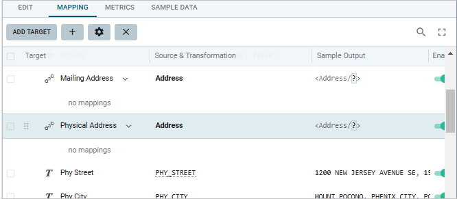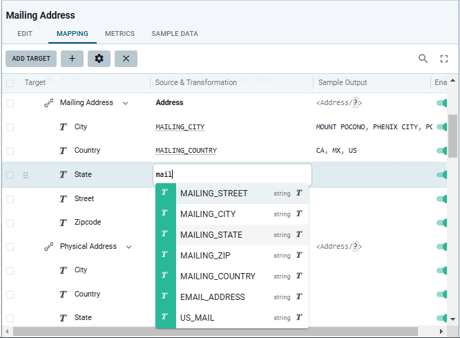 Double-click in the Source & Transformation field for Mailing Address. Alternatively, select the Mailing Address row and click the gear icon in the toolbar of the Mapping tab. The Mapping Details screen opens. Edit the mapping: