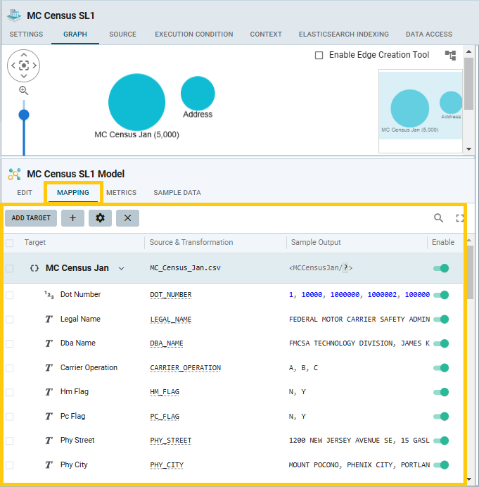Click the model item at the top of the right pane. Go to the Mapping tab in the model profile (the middle frame). The original MC Census Jan mapping is shown. Expand it to view the properties: