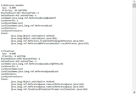 You can also check specifically for blocked or deadlocked threads by replacing stack in the URL with block or deadlock. To check for blocked threads, go to the following URL: