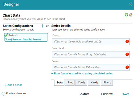 The Series Configurations section of the screen contains settings to manage each series. One series is created by default. A series is a set of data to display on the chart, for example a line on a line or area chart or one set of columns on a column or bar chart. The details for the selected series appear in Series Details, which contains settings to define the details of the selected series, such as the data to display as well as formatting and labels. From Series Configurations, you can clone, rename, disable (remove the series from the chart without deleting it), or remove a series. You can add a series by clicking the plus icon (