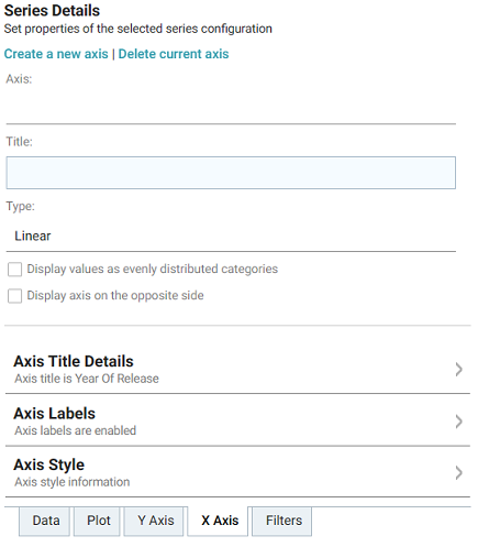 | Axis | The Axis and Title settings are populated with the values from the Group and Group Label values from the Data tab. If multiple axes exist, you can selected a different value to use for the X axis. |
