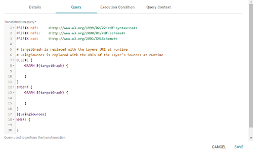 - When you have finished configuring the Details tab, click the Query tab. This tab defines the query that this step should run. The template includes the syntax for writing SPARQL INSERT and DELETE queries and includes the target and source graph parameters (