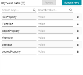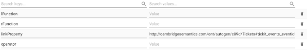 8. In each row, specify the desired Value for the key. For example, in the image below, the property URI http://cambridgesemantics.com/ont/autogen/c89d/Tickets#tickit_events_eventid is specified as the Value for the linkProperty key.